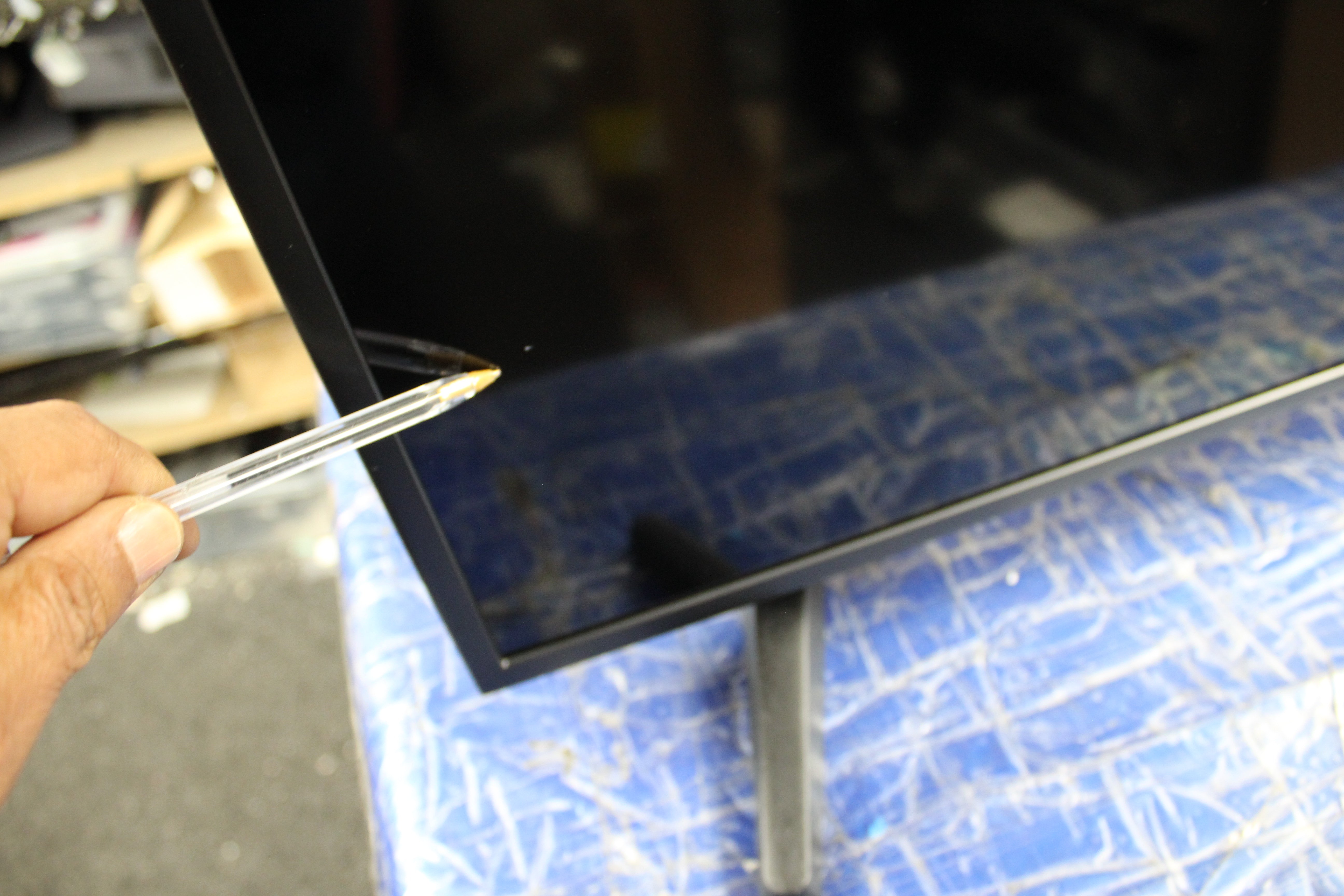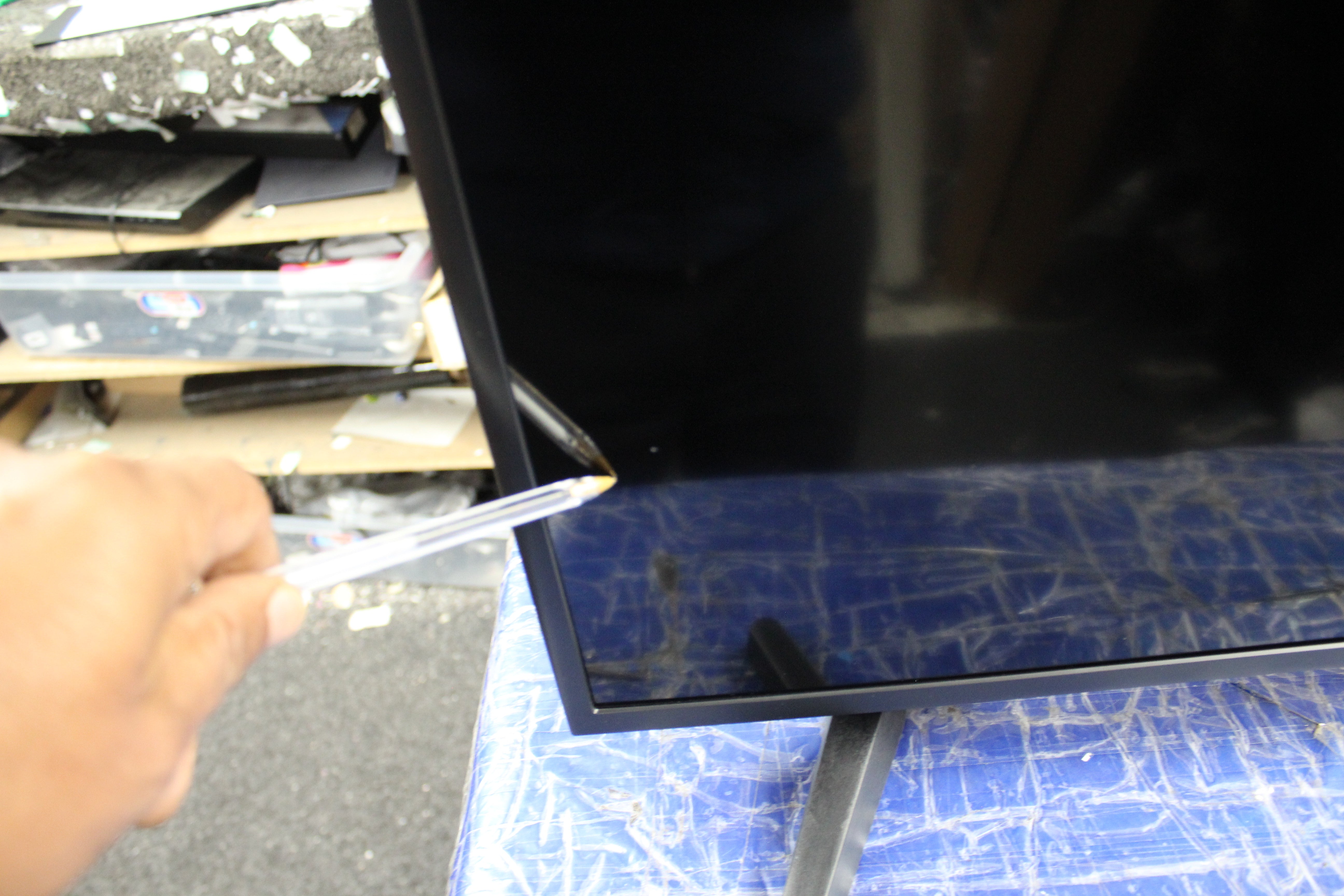 Item supplied with a minor mark on the screen, this will blend into the image when switched on. Also there is no base stand making it ideal for wall mounting. Please see pictures for more details.
